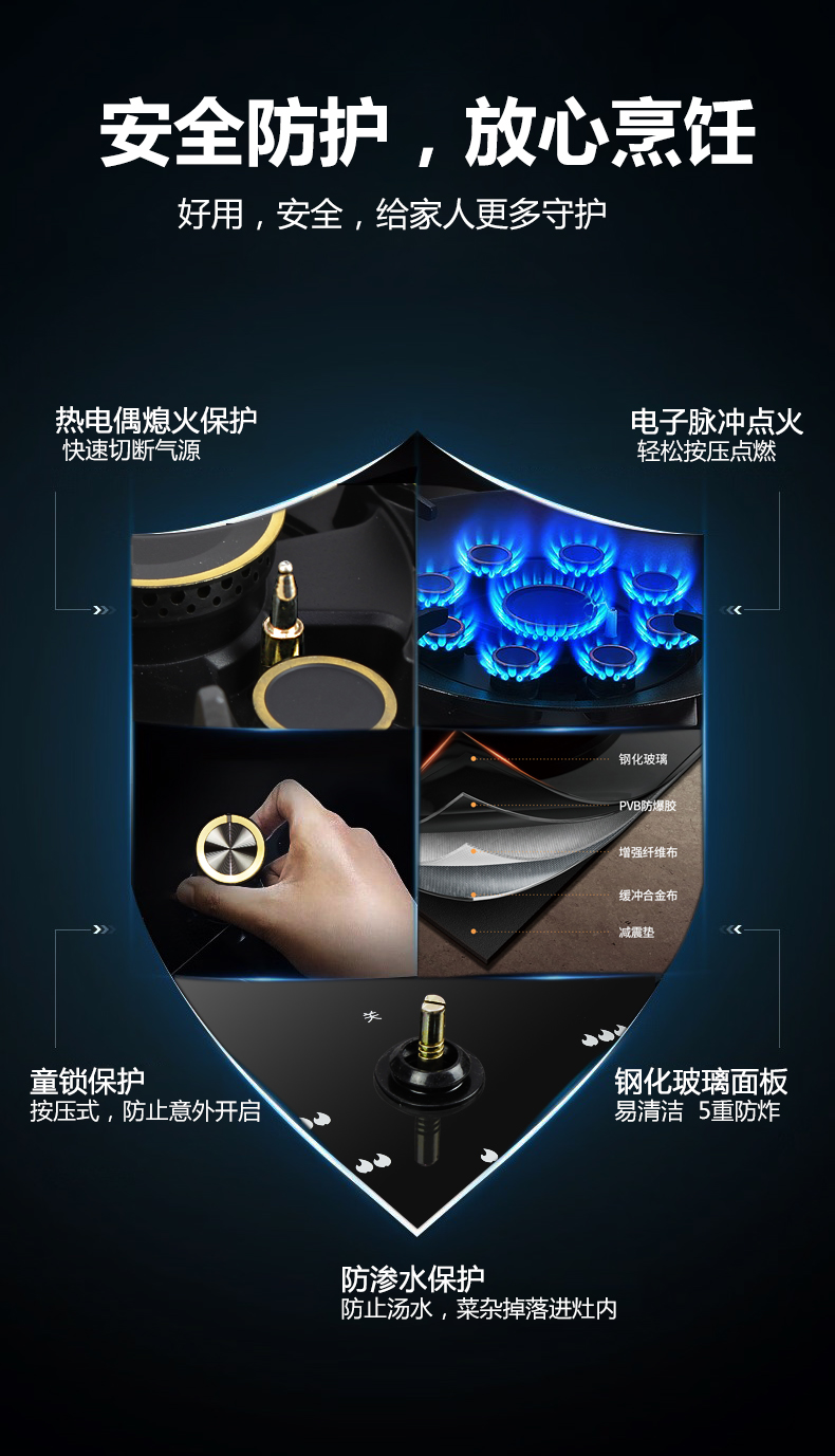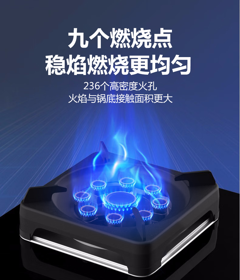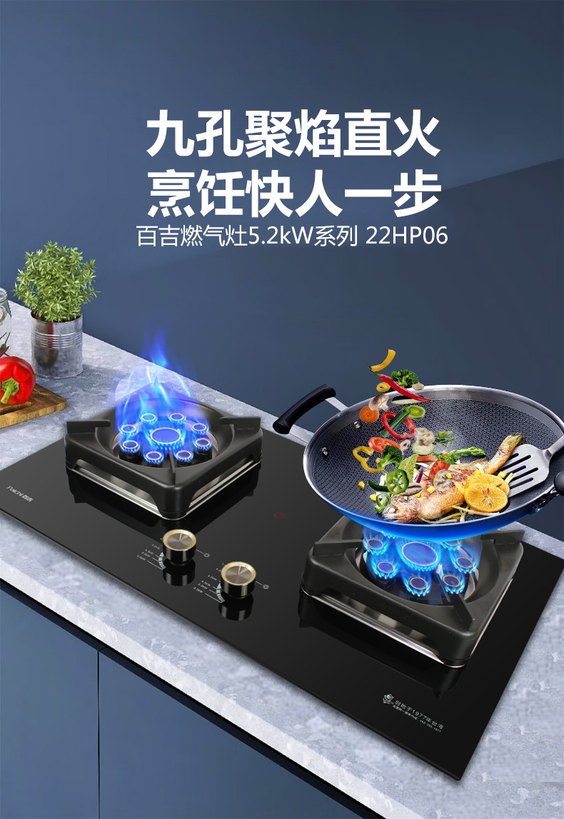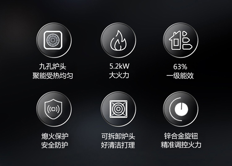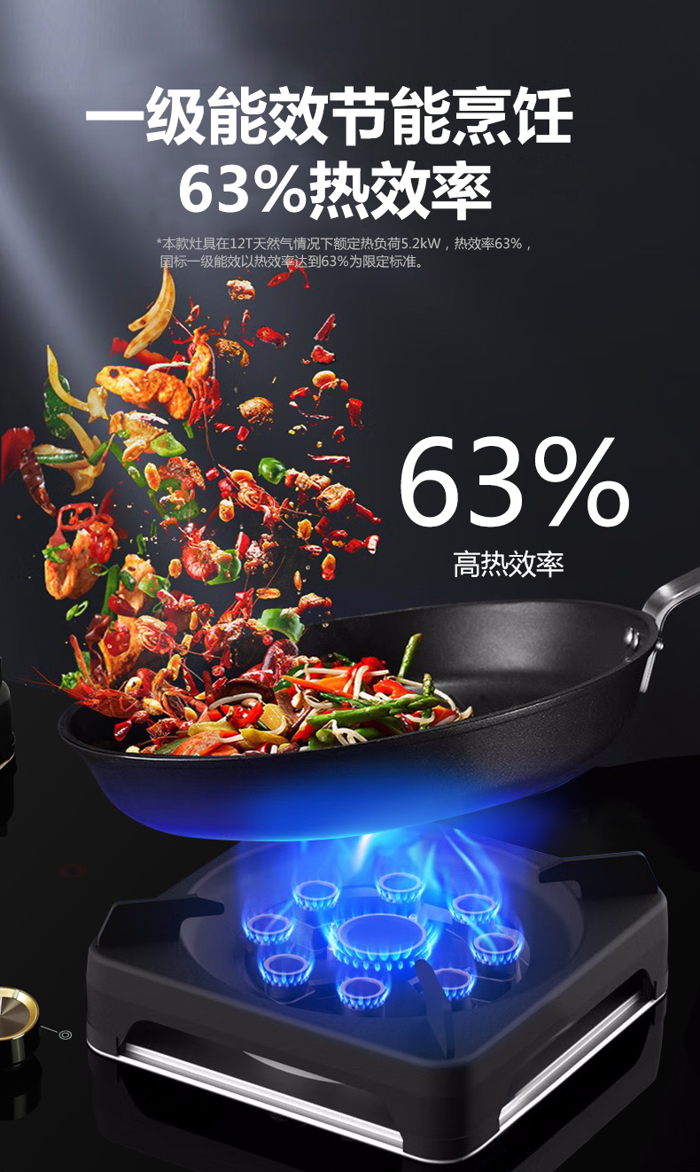 5.2kW聚能猛火灶,63%熱效率一級能效,帶熄火保護裝置